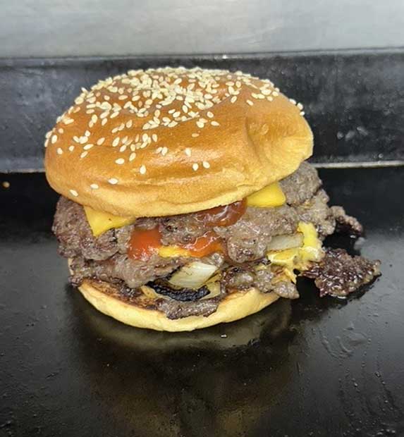Fresh Smashed Beef Patty, Tangy Relish, Cheese, and Griddled Onions, topped with our flavourful Beef Sizzler and Algerian sauce -